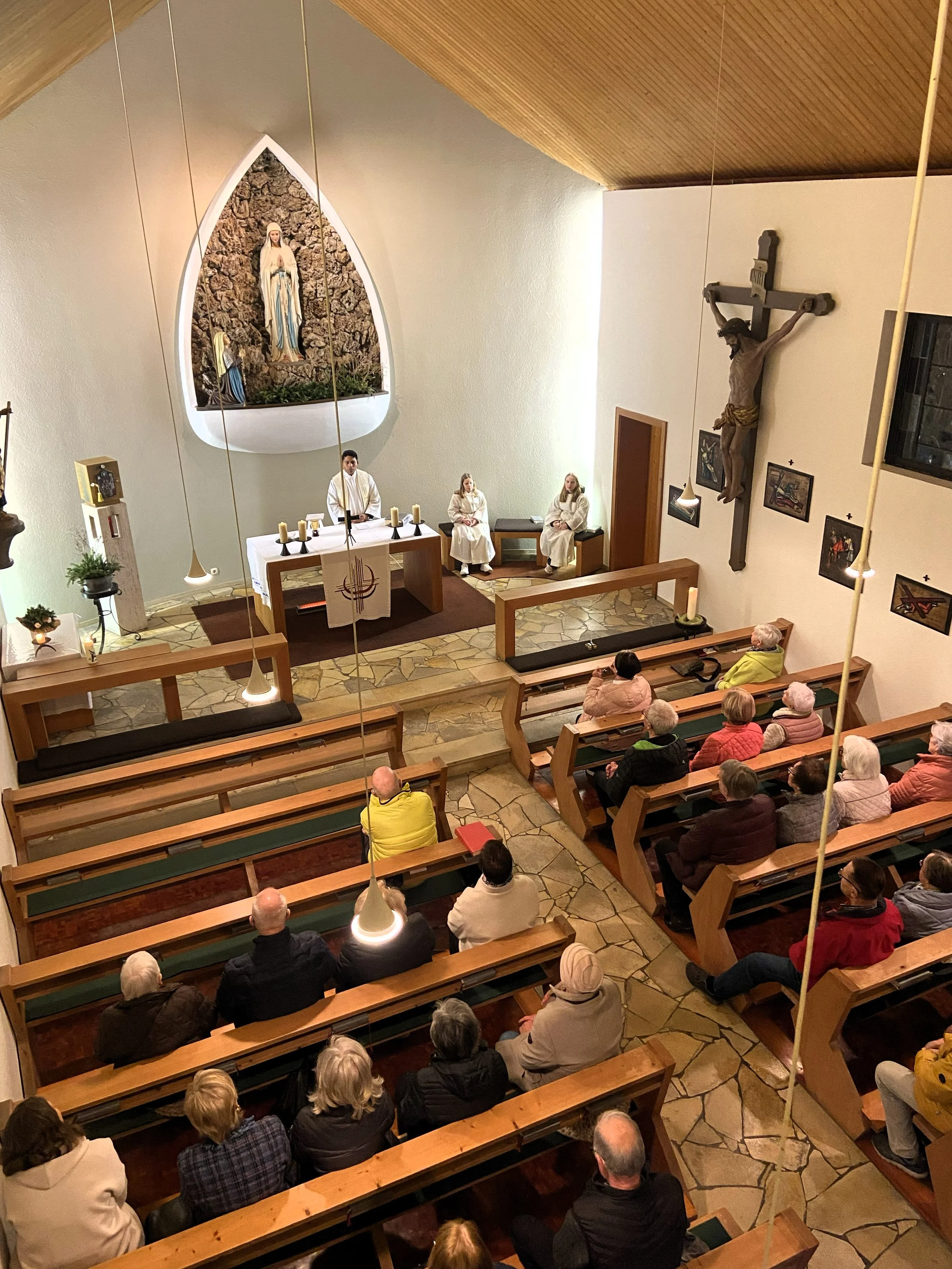 Die Messe selbst wurde von Präses Inosens mit viel Herz und Charme gestaltet – eine perfekte Mischung aus Andacht und Unterhaltung. Nach dem Gottesdienst bot sich die Gelegenheit, vor der Kapelle in lockerer Runde ins Gespräch zu kommen und die Gemeinschaft zu genießen.