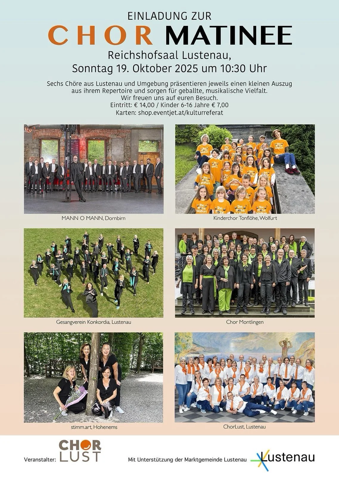 Der Lustenauer Chor CHORLUST veranstaltet gemeinsam mit Chören aus Lustenau und Umgebung einen beschwingten Sonntagvormittag. Die Chöre präsentieren jeweils 3 Lieder und sorgen für eine geballte musikalische Vielfalt. Wir freuen uns auf Ihren Besuch!